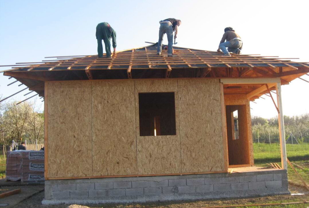 - Opšivanje: kalkanski delovi se oblažu OSB pločama debljine 15 mm, dok se venci krova opšivaju rendisanom daskom.